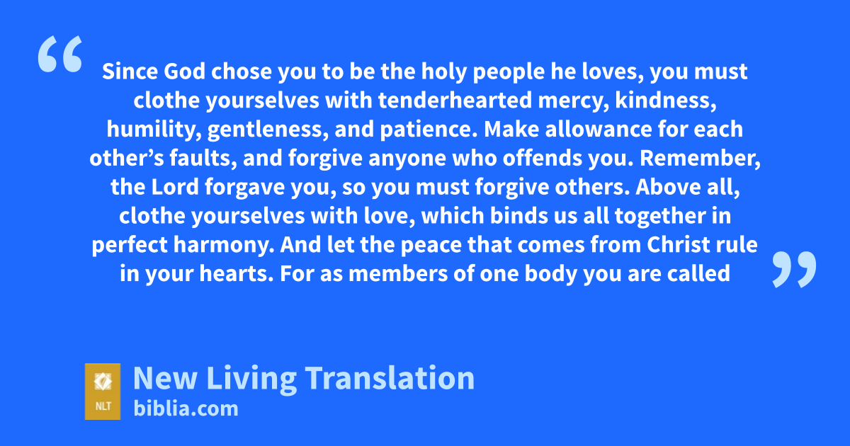 12 Since God chose you to be the holy people he loves, you must clothe yourselves with tenderhearted mercy, kindness, humility, gentleness, and patience. 13 Make allowance for each other’s faults, and forgive anyone who offends you. Remember, the Lord forgave you, so you must forgive others. 14 Above all, clothe yourselves with love, which binds us all together in perfect harmony. 15 And let the peace that comes from Christ rule in your hearts. For as members of one body you are called to live in peace. And always be thankful.