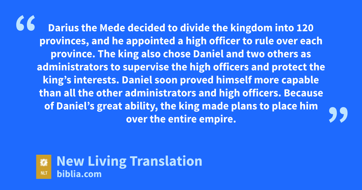 1 * Darius the Mede decided to divide the kingdom into 120 provinces, and he appointed a high officer to rule over each province. 2 The king also chose Daniel and two others as administrators to supervise the high officers and protect the king’s interests. 3 Daniel soon proved himself more capable than all the other administrators and high officers. Because of Daniel’s great ability, the king made plans to place him over the entire empire.