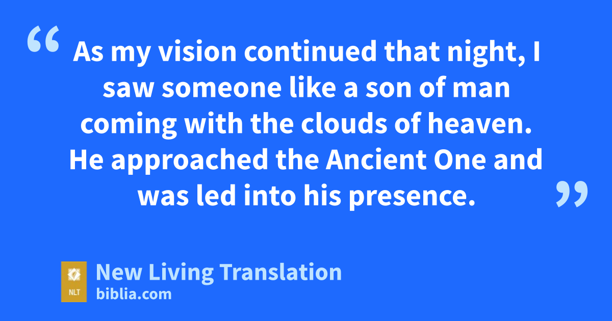 13 As my vision continued that night, I saw someone like a son of man* coming with the clouds of heaven. He approached the Ancient One and was led into his presence. 14 He was given authority, honor, and sovereignty over all the nations of the world, so that people of every race and nation and language would obey him. His rule is eternal—it will never end. His kingdom will never be destroyed.
