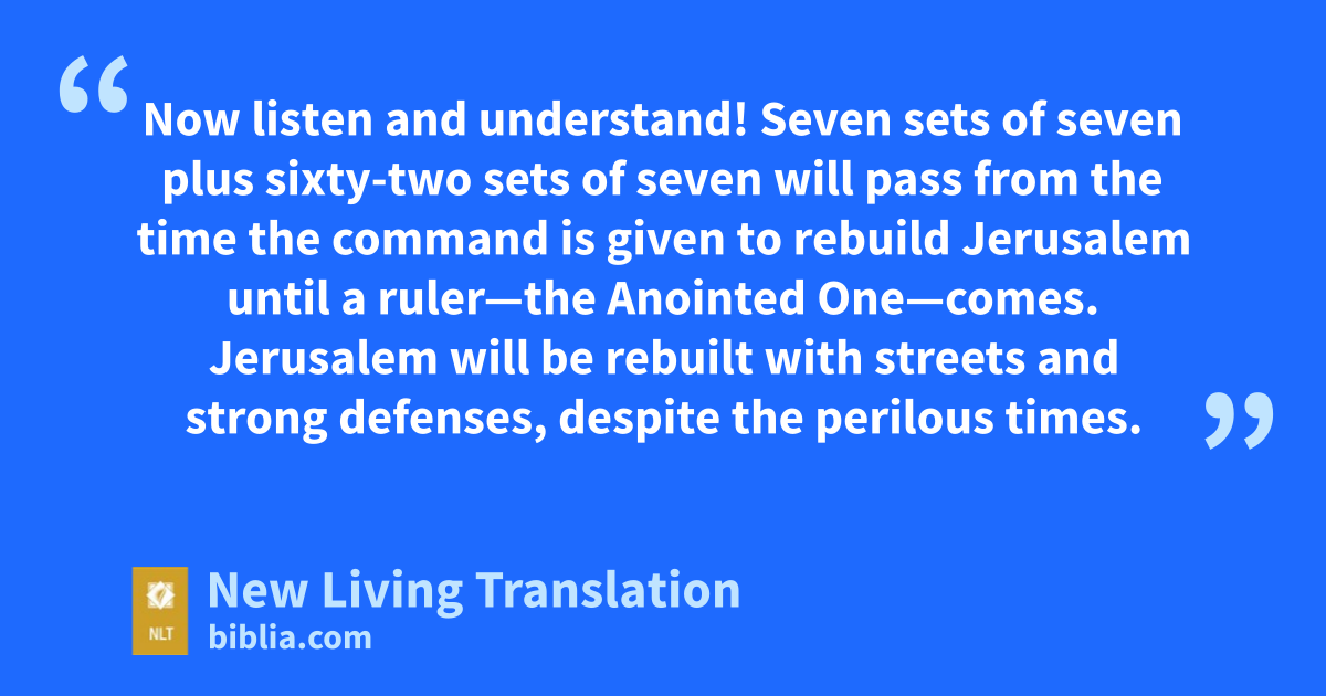 24 “A period of seventy sets of seven* has been decreed for your people and your holy city to finish their rebellion, to put an end to their sin, to atone for their guilt, to bring in everlasting righteousness, to confirm the prophetic vision, and to anoint the Most Holy Place.* 25 Now listen and understand! Seven sets of seven plus sixty-two sets of seven* will pass from the time the command is given to rebuild Jerusalem until a ruler—the Anointed One* —comes. Jerusalem will be rebuilt with streets and strong defenses,* despite the perilous times.