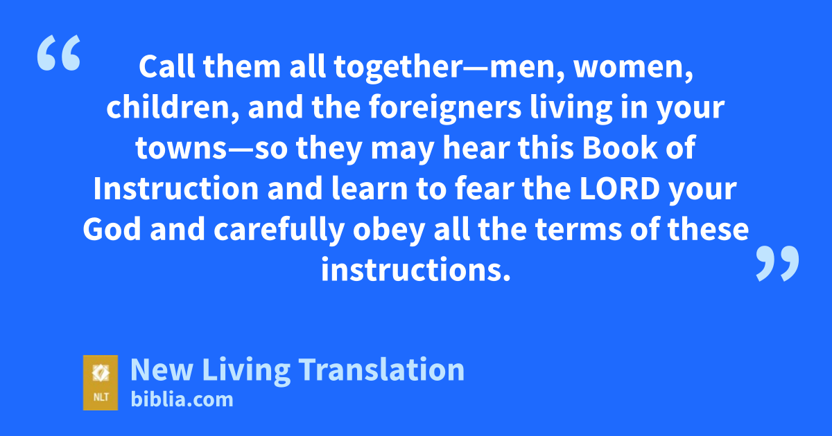 9 So Moses wrote this entire body of instruction in a book and gave it to the priests, who carried the Ark of the Lord’s Covenant, and to the elders of Israel. 10 Then Moses gave them this command: “At the end of every seventh year, the Year of Release, during the Festival of Shelters, 11 you must read this Book of Instruction to all the people of Israel when they assemble before the Lord your God at the place he chooses. 12 Call them all together—men, women, children, and the foreigners living in your towns—so they may hear this Book of Instruction and learn to fear the Lord your God and carefully obey all the terms of these instructions. 13 Do this so that your children who have not known these instructions will hear them and will learn to fear the Lord your God. Do this as long as you live in the land you are crossing the Jordan to occupy.”