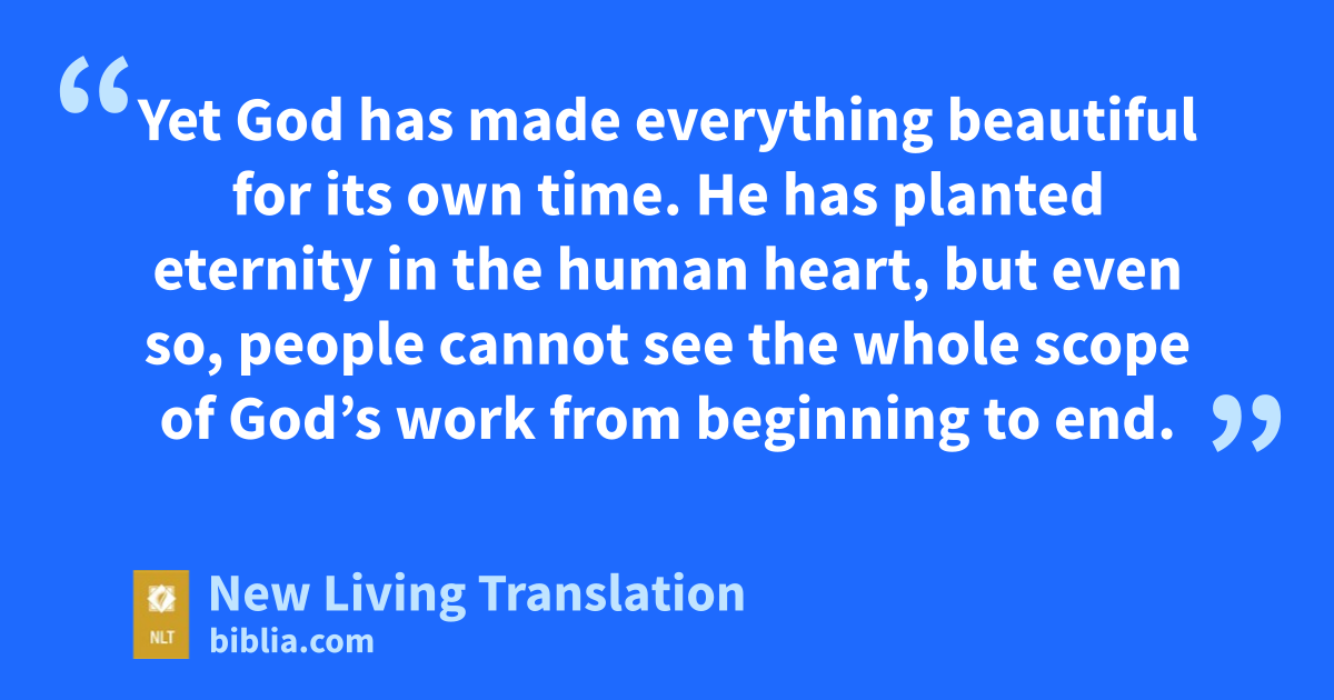 9 What do people really get for all their hard work? 10 I have seen the burden God has placed on us all. 11 Yet God has made everything beautiful for its own time. He has planted eternity in the human heart, but even so, people cannot see the whole scope of God’s work from beginning to end. 12 So I concluded there is nothing better than to be happy and enjoy ourselves as long as we can. 13 And people should eat and drink and enjoy the fruits of their labor, for these are gifts from God.