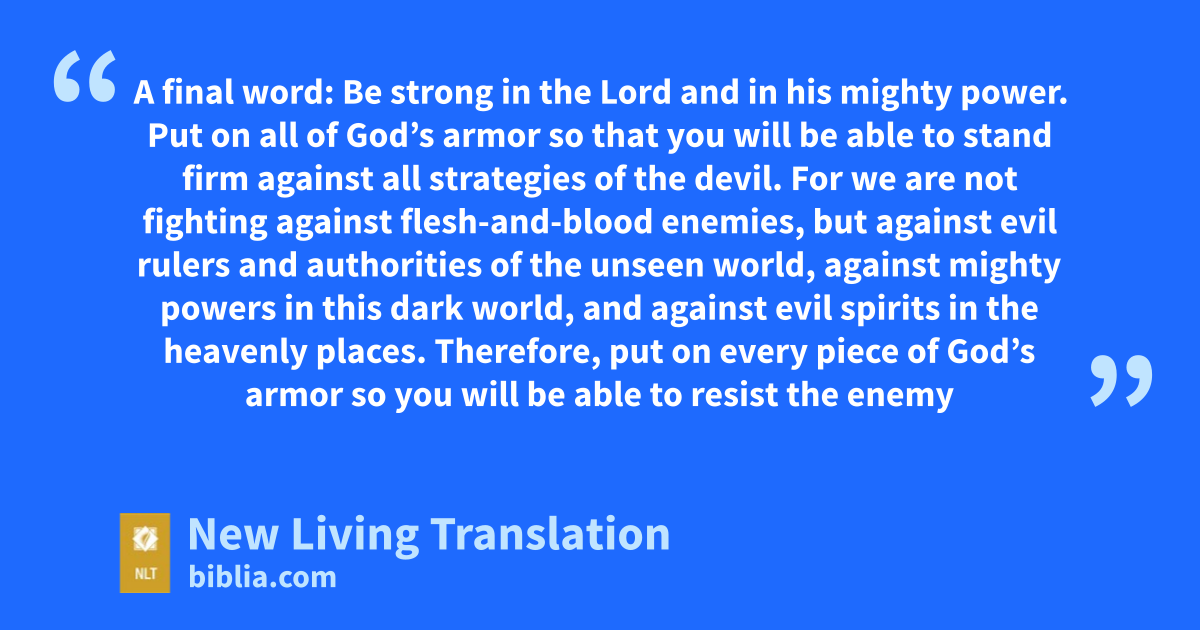 10 A final word: Be strong in the Lord and in his mighty power. 11 Put on all of God’s armor so that you will be able to stand firm against all strategies of the devil. 12 For we* are not fighting against flesh-and-blood enemies, but against evil rulers and authorities of the unseen world, against mighty powers in this dark world, and against evil spirits in the heavenly places.