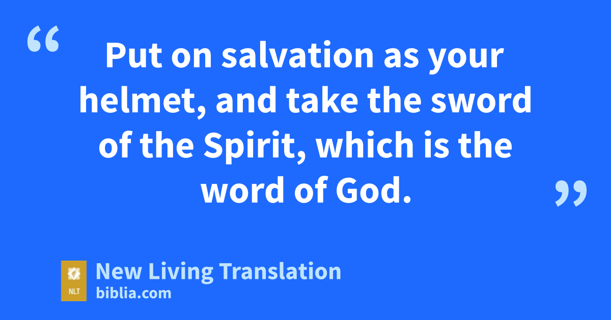 13 Therefore, put on every piece of God’s armor so you will be able to resist the enemy in the time of evil. Then after the battle you will still be standing firm. 14 Stand your ground, putting on the belt of truth and the body armor of God’s righteousness. 15 For shoes, put on the peace that comes from the Good News so that you will be fully prepared.* 16 In addition to all of these, hold up the shield of faith to stop the fiery arrows of the devil.* 17 Put on salvation as your helmet, and take the sword of the Spirit, which is the word of God.