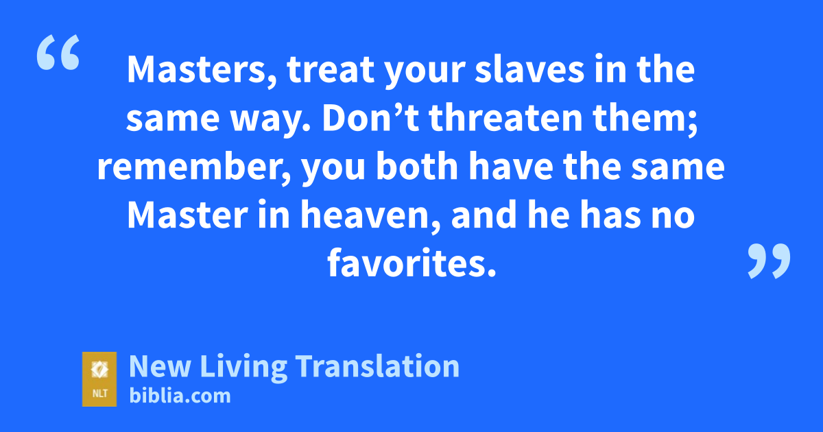 9 Masters, treat your slaves in the same way. Don’t threaten them; remember, you both have the same Master in heaven, and he has no favorites.