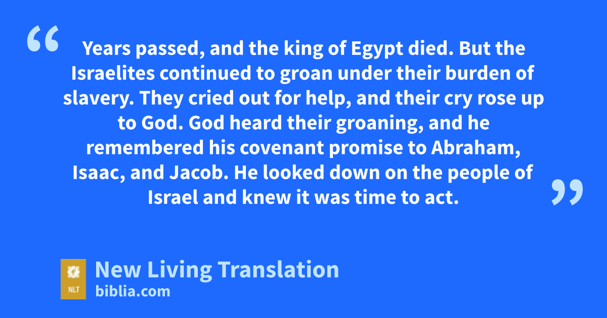 23 Years passed, and the king of Egypt died. But the Israelites continued to groan under their burden of slavery. They cried out for help, and their cry rose up to God. 24 God heard their groaning, and he remembered his covenant promise to Abraham, Isaac, and Jacob. 25 He looked down on the people of Israel and knew it was time to act.*
