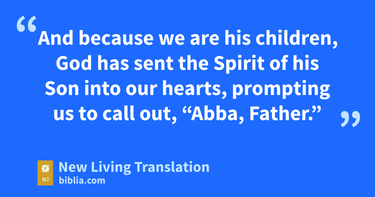 4 But when the right time came, God sent his Son, born of a woman, subject to the law. 5 God sent him to buy freedom for us who were slaves to the law, so that he could adopt us as his very own children.* 6 And because we* are his children, God has sent the Spirit of his Son into our hearts, prompting us to call out, “Abba, Father.”* 7 Now you are no longer a slave but God’s own child.* And since you are his child, God has made you his heir.