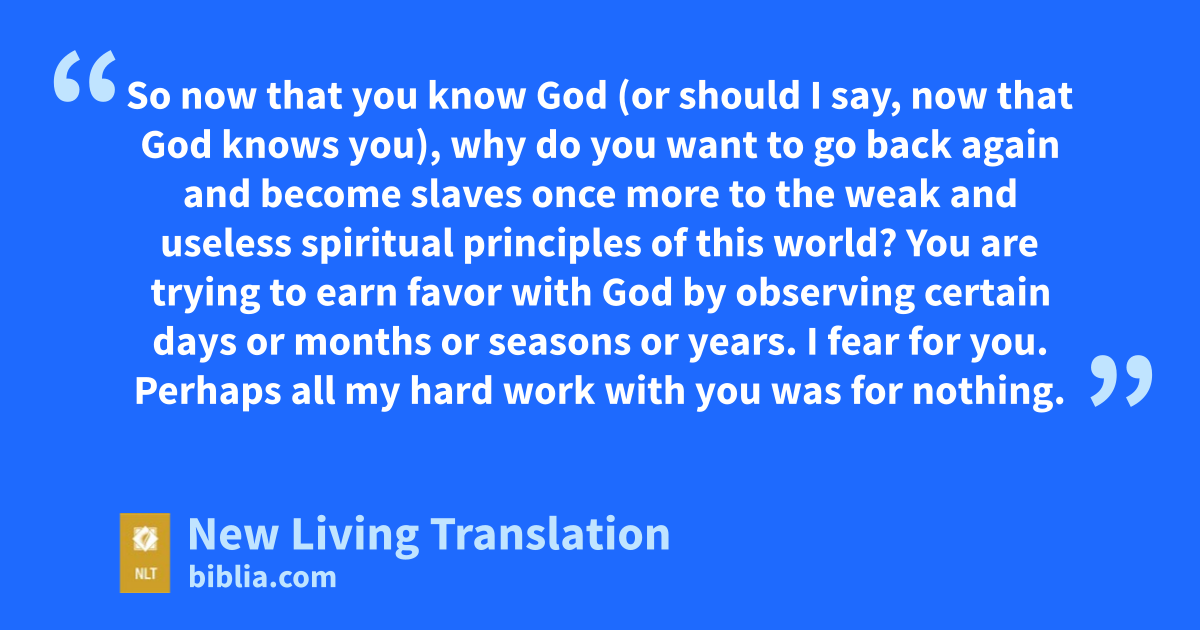 8 Before you Gentiles knew God, you were slaves to so-called gods that do not even exist. 9 So now that you know God (or should I say, now that God knows you), why do you want to go back again and become slaves once more to the weak and useless spiritual principles of this world? 10 You are trying to earn favor with God by observing certain days or months or seasons or years. 11 I fear for you. Perhaps all my hard work with you was for nothing. 12 Dear brothers and sisters,* I plead with you to live as I do in freedom from these things, for I have become like you Gentiles—free from those laws.