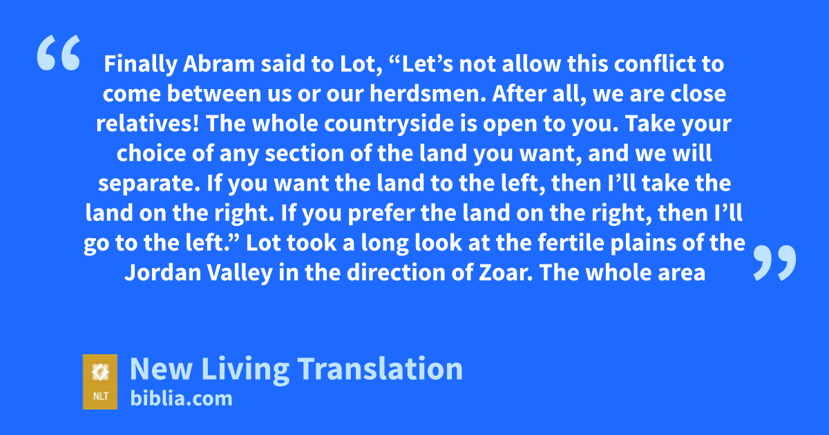 8 Finally Abram said to Lot, “Let’s not allow this conflict to come between us or our herdsmen. After all, we are close relatives! 9 The whole countryside is open to you. Take your choice of any section of the land you want, and we will separate. If you want the land to the left, then I’ll take the land on the right. If you prefer the land on the right, then I’ll go to the left.”