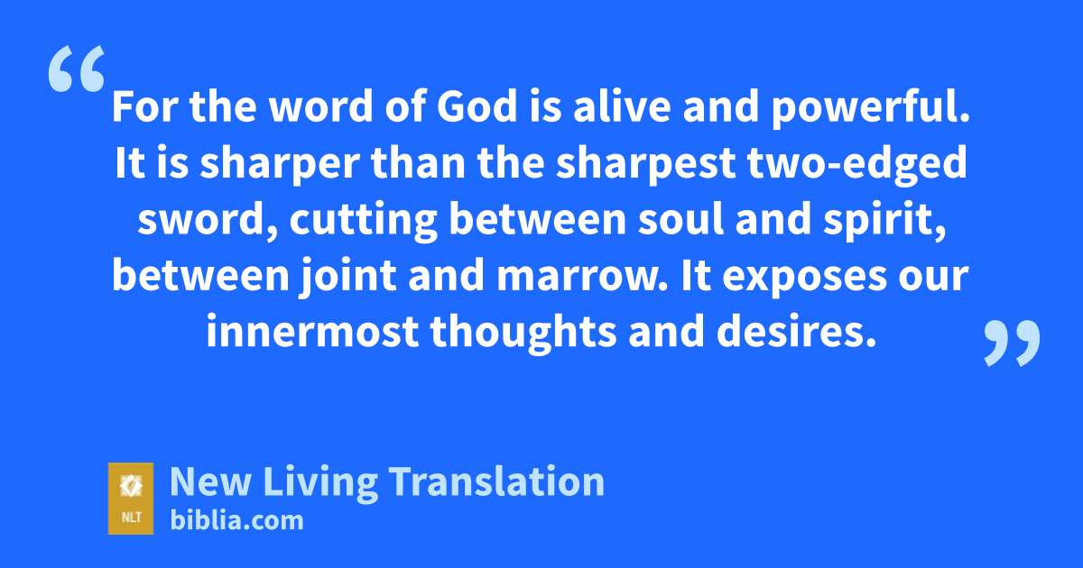 12 For the word of God is alive and powerful. It is sharper than the sharpest two-edged sword, cutting between soul and spirit, between joint and marrow. It exposes our innermost thoughts and desires. 13 Nothing in all creation is hidden from God. Everything is naked and exposed before his eyes, and he is the one to whom we are accountable.