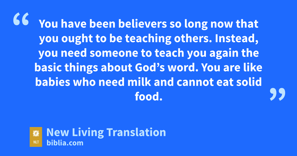11 There is much more we would like to say about this, but it is difficult to explain, especially since you are spiritually dull and don’t seem to listen. 12 You have been believers so long now that you ought to be teaching others. Instead, you need someone to teach you again the basic things about God’s word.* You are like babies who need milk and cannot eat solid food. 13 For someone who lives on milk is still an infant and doesn’t know how to do what is right. 14 Solid food is for those who are mature, who through training have the skill to recognize the difference between right and wrong.