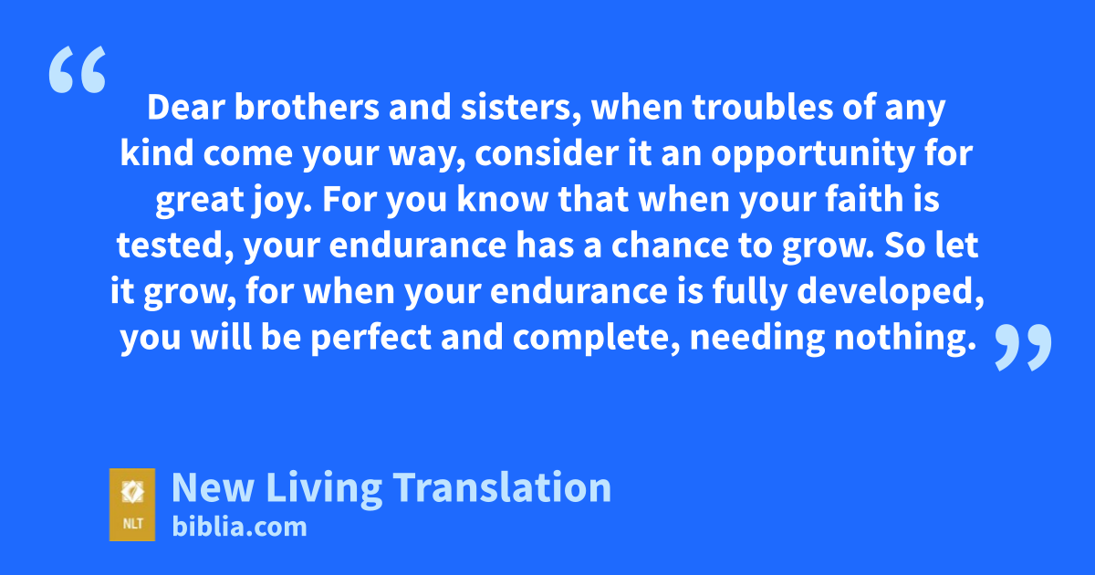 2 Dear brothers and sisters,* when troubles of any kind come your way, consider it an opportunity for great joy. 3 For you know that when your faith is tested, your endurance has a chance to grow. 4 So let it grow, for when your endurance is fully developed, you will be perfect and complete, needing nothing.