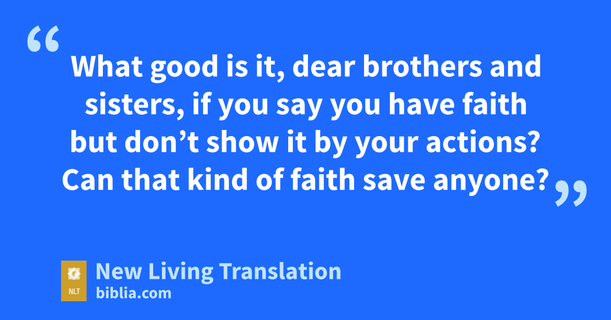 14 What good is it, dear brothers and sisters, if you say you have faith but don’t show it by your actions? Can that kind of faith save anyone? 15 Suppose you see a brother or sister who has no food or clothing, 16 and you say, “Good-bye and have a good day; stay warm and eat well”—but then you don’t give that person any food or clothing. What good does that do?