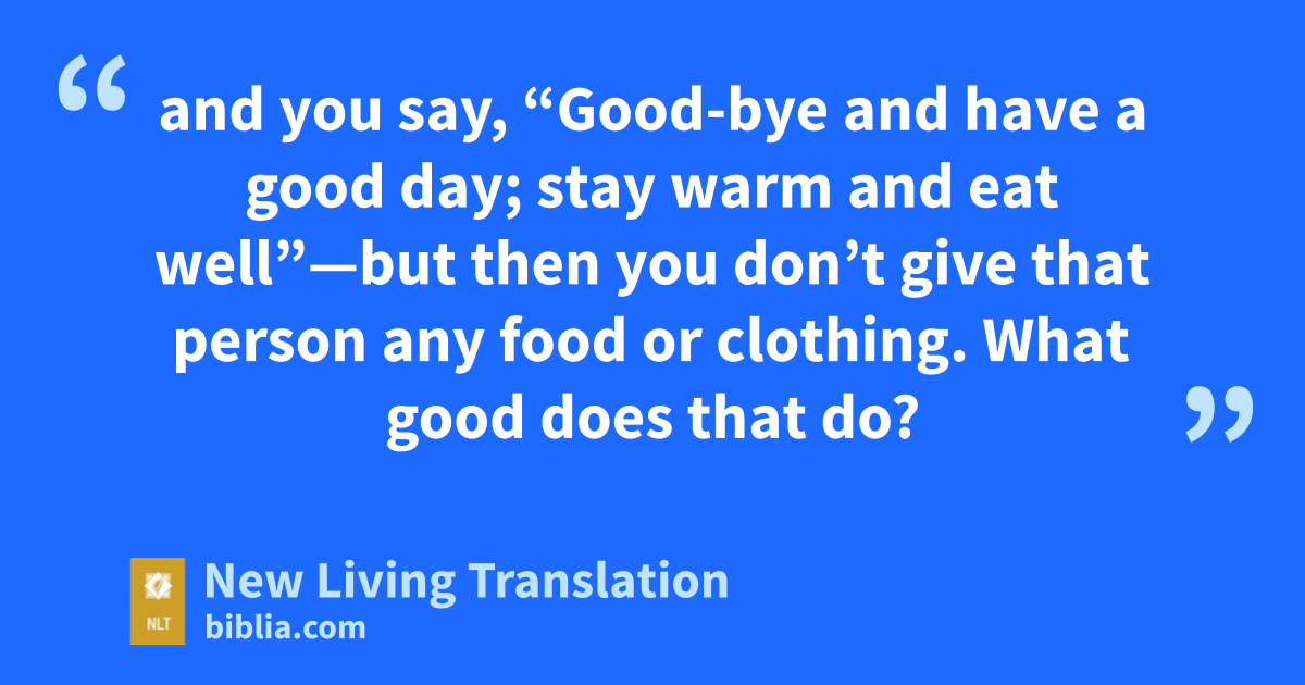 14 What good is it, dear brothers and sisters, if you say you have faith but don’t show it by your actions? Can that kind of faith save anyone? 15 Suppose you see a brother or sister who has no food or clothing, 16 and you say, “Good-bye and have a good day; stay warm and eat well”—but then you don’t give that person any food or clothing. What good does that do?