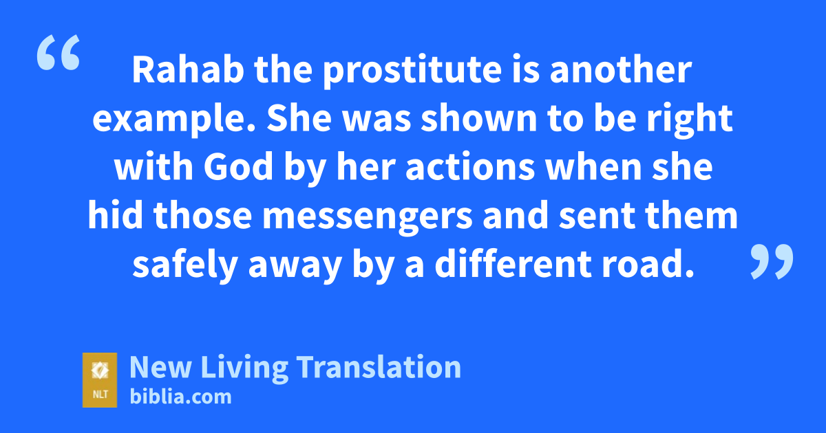 25 Rahab the prostitute is another example. She was shown to be right with God by her actions when she hid those messengers and sent them safely away by a different road. 26 Just as the body is dead without breath,* so also faith is dead without good works.