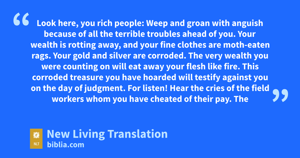 Look here, you rich people: Weep and groan with anguish because of all the terrible troubles ahead of you. 2 Your wealth is rotting away, and your fine clothes are moth-eaten rags. 3 Your gold and silver are corroded. The very wealth you were counting on will eat away your flesh like fire. This corroded treasure you have hoarded will testify against you on the day of judgment. 4 For listen! Hear the cries of the field workers whom you have cheated of their pay. The cries of those who harvest your fields have reached the ears of the Lord of Heaven’s Armies.