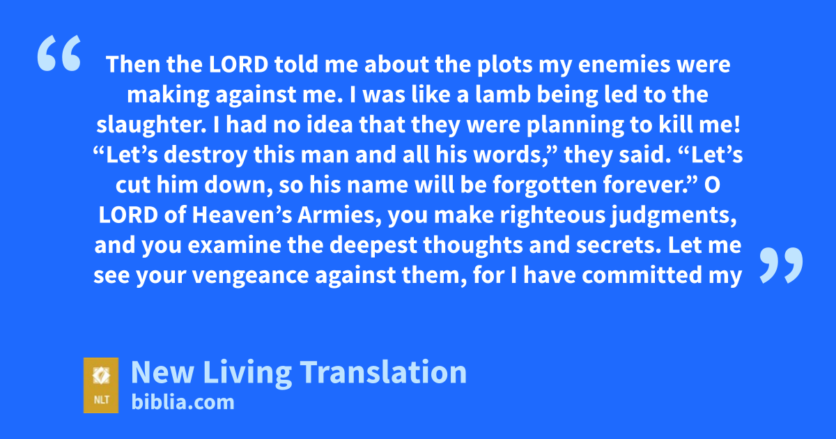 18 Then the Lord told me about the plots my enemies were making against me. 19 I was like a lamb being led to the slaughter. I had no idea that they were planning to kill me! “Let’s destroy this man and all his words,” they said. “Let’s cut him down, so his name will be forgotten forever.”