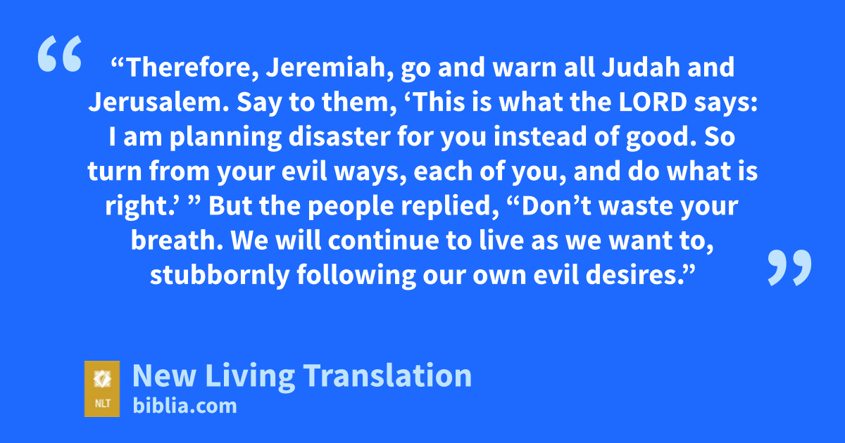 11 “Therefore, Jeremiah, go and warn all Judah and Jerusalem. Say to them, ‘This is what the Lord says: I am planning disaster for you instead of good. So turn from your evil ways, each of you, and do what is right.’ ”