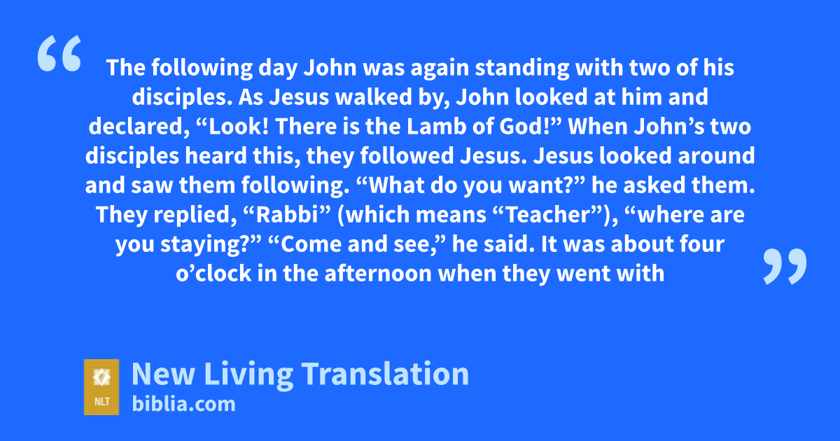 35 The following day John was again standing with two of his disciples. 36 As Jesus walked by, John looked at him and declared, “Look! There is the Lamb of God!” 37 When John’s two disciples heard this, they followed Jesus.