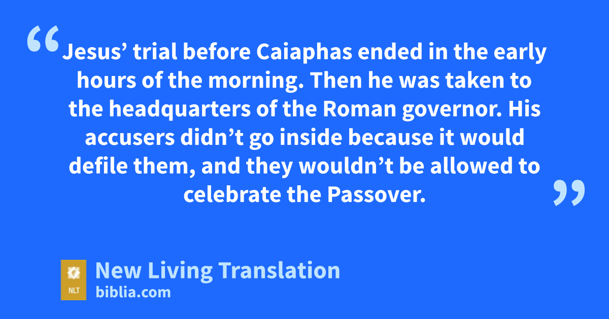28 Jesus’ trial before Caiaphas ended in the early hours of the morning. Then he was taken to the headquarters of the Roman governor.* His accusers didn’t go inside because it would defile them, and they wouldn’t be allowed to celebrate the Passover. 29 So Pilate, the governor, went out to them and asked, “What is your charge against this man?”