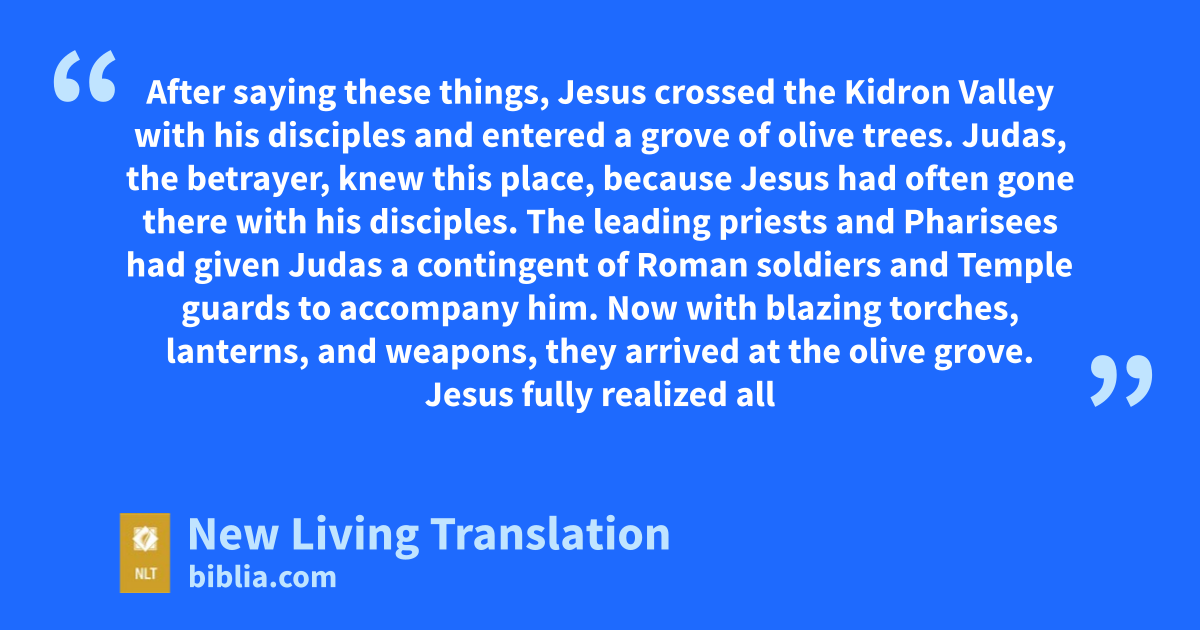 After saying these things, Jesus crossed the Kidron Valley with his disciples and entered a grove of olive trees. 2 Judas, the betrayer, knew this place, because Jesus had often gone there with his disciples. 3 The leading priests and Pharisees had given Judas a contingent of Roman soldiers and Temple guards to accompany him. Now with blazing torches, lanterns, and weapons, they arrived at the olive grove.