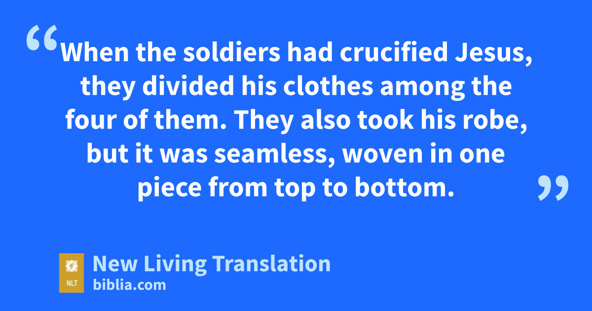 23 When the soldiers had crucified Jesus, they divided his clothes among the four of them. They also took his robe, but it was seamless, woven in one piece from top to bottom. 24 So they said, “Rather than tearing it apart, let’s throw dice* for it.” This fulfilled the Scripture that says, “They divided my garments among themselves and threw dice for my clothing.”* So that is what they did.