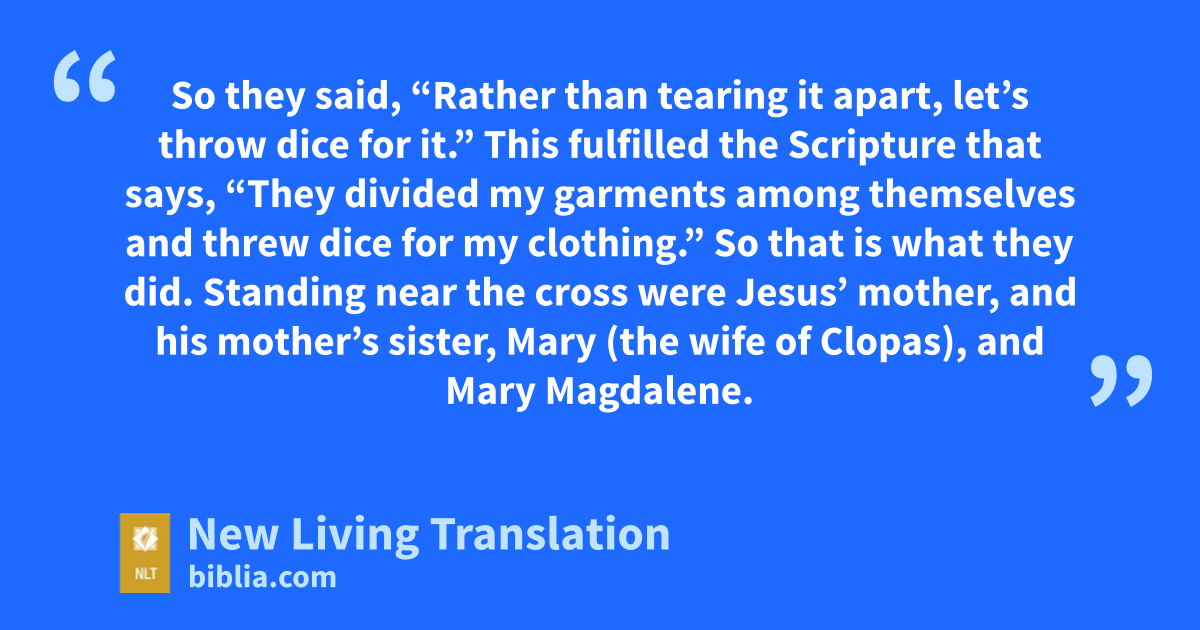 23 When the soldiers had crucified Jesus, they divided his clothes among the four of them. They also took his robe, but it was seamless, woven in one piece from top to bottom. 24 So they said, “Rather than tearing it apart, let’s throw dice* for it.” This fulfilled the Scripture that says, “They divided my garments among themselves and threw dice for my clothing.”* So that is what they did.