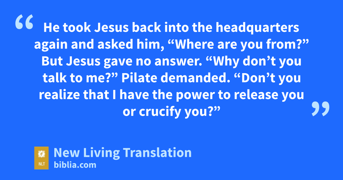 8 When Pilate heard this, he was more frightened than ever. 9 He took Jesus back into the headquarters* again and asked him, “Where are you from?” But Jesus gave no answer. 10 “Why don’t you talk to me?” Pilate demanded. “Don’t you realize that I have the power to release you or crucify you?”