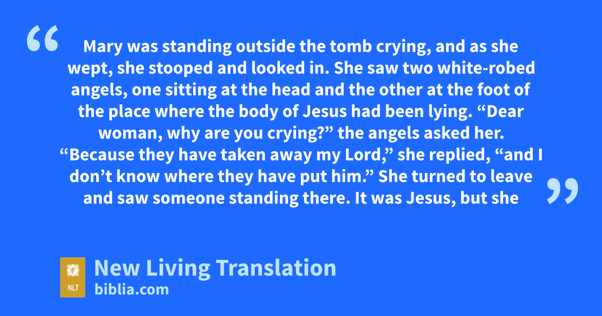 11 Mary was standing outside the tomb crying, and as she wept, she stooped and looked in. 12 She saw two white-robed angels, one sitting at the head and the other at the foot of the place where the body of Jesus had been lying. 13 “Dear woman, why are you crying?” the angels asked her.