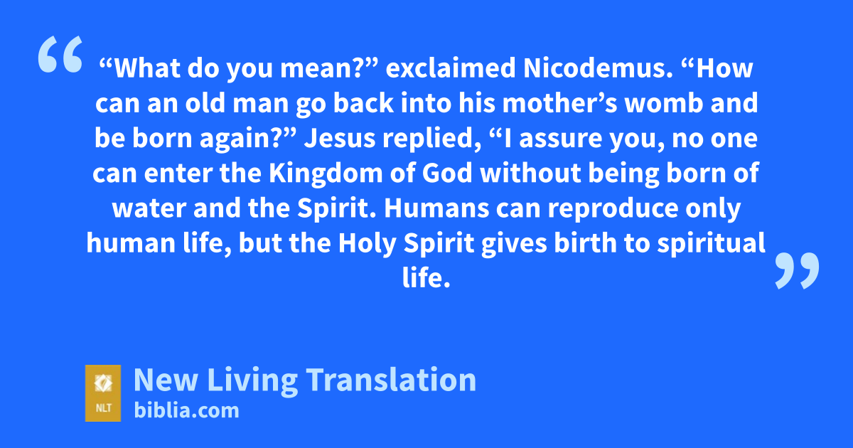 5 Jesus replied, “I assure you, no one can enter the Kingdom of God without being born of water and the Spirit.* 6 Humans can reproduce only human life, but the Holy Spirit gives birth to spiritual life.* 7 So don’t be surprised when I say, ‘You* must be born again.’ 8 The wind blows wherever it wants. Just as you can hear the wind but can’t tell where it comes from or where it is going, so you can’t explain how people are born of the Spirit.”