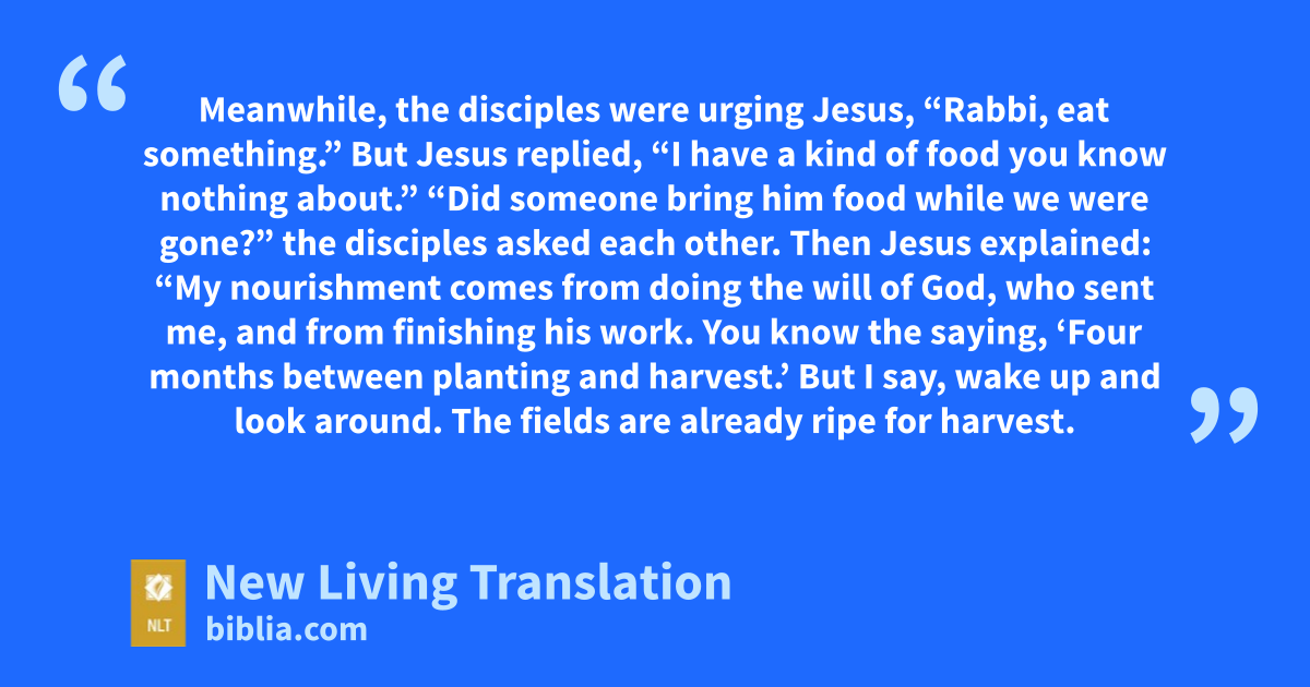 34 Then Jesus explained: “My nourishment comes from doing the will of God, who sent me, and from finishing his work. 35 You know the saying, ‘Four months between planting and harvest.’ But I say, wake up and look around. The fields are already ripe* for harvest. 36 The harvesters are paid good wages, and the fruit they harvest is people brought to eternal life. What joy awaits both the planter and the harvester alike! 37 You know the saying, ‘One plants and another harvests.’ And it’s true. 38 I sent you to harvest where you didn’t plant; others had already done the work, and now you will get to gather the harvest.”