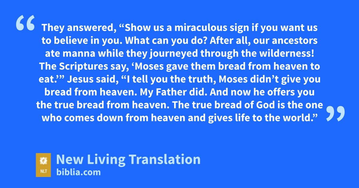 30 They answered, “Show us a miraculous sign if you want us to believe in you. What can you do? 31 After all, our ancestors ate manna while they journeyed through the wilderness! The Scriptures say, ‘Moses gave them bread from heaven to eat.’* ”