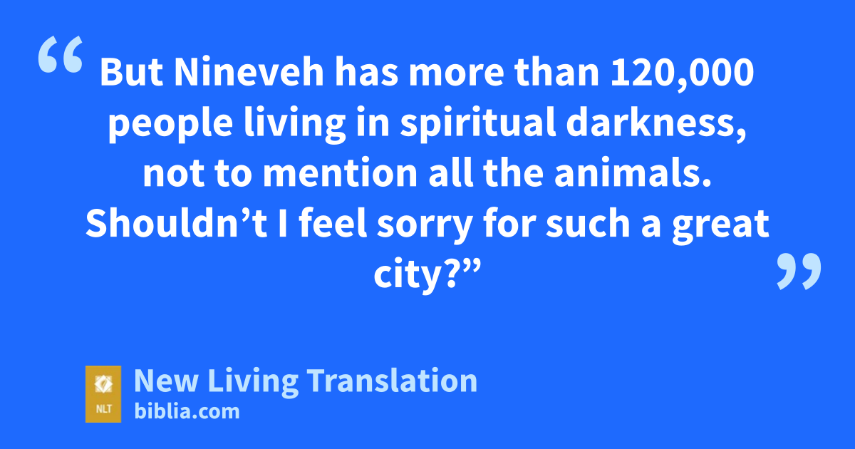 10 Then the Lord said, “You feel sorry about the plant, though you did nothing to put it there. It came quickly and died quickly. 11 But Nineveh has more than 120,000 people living in spiritual darkness,* not to mention all the animals. Shouldn’t I feel sorry for such a great city?”