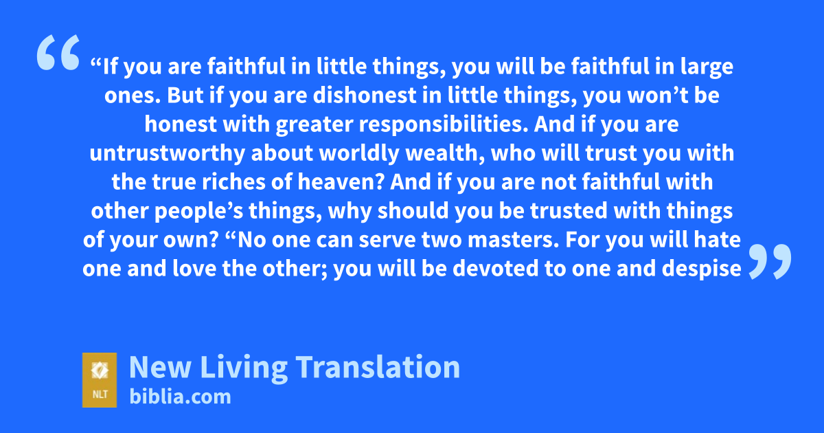 10 “If you are faithful in little things, you will be faithful in large ones. But if you are dishonest in little things, you won’t be honest with greater responsibilities. 11 And if you are untrustworthy about worldly wealth, who will trust you with the true riches of heaven? 12 And if you are not faithful with other people’s things, why should you be trusted with things of your own?