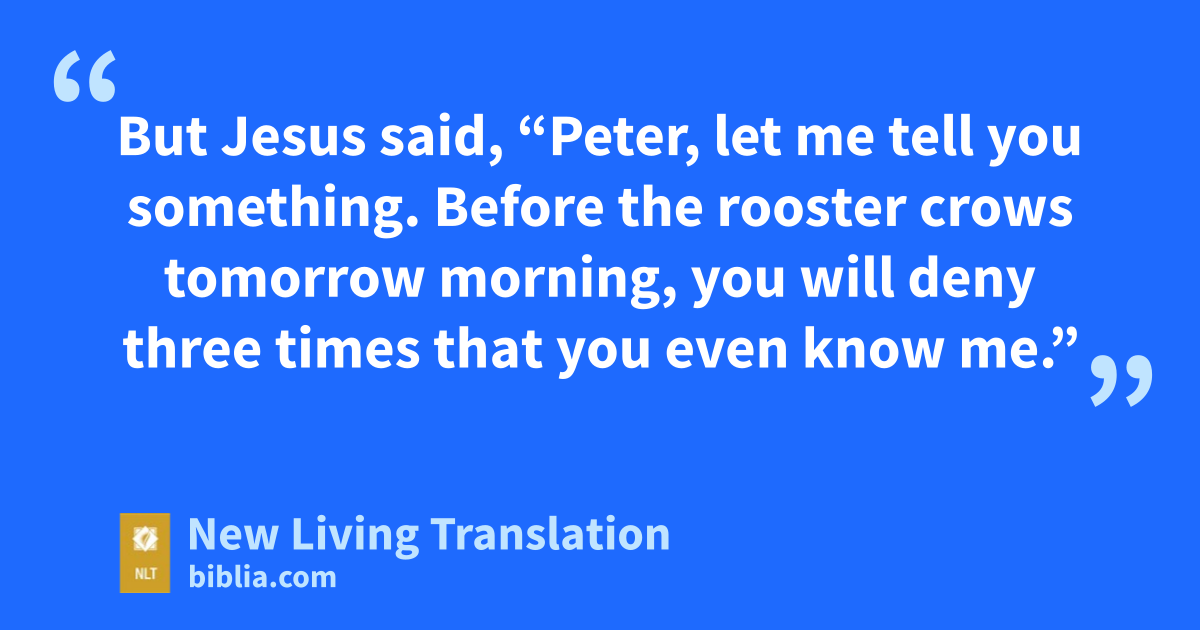 34 But Jesus said, “Peter, let me tell you something. Before the rooster crows tomorrow morning, you will deny three times that you even know me.”