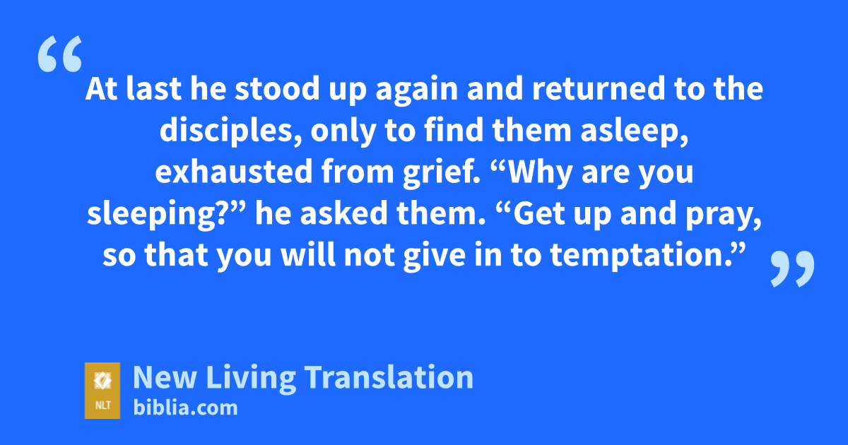 45 At last he stood up again and returned to the disciples, only to find them asleep, exhausted from grief. 46 “Why are you sleeping?” he asked them. “Get up and pray, so that you will not give in to temptation.”