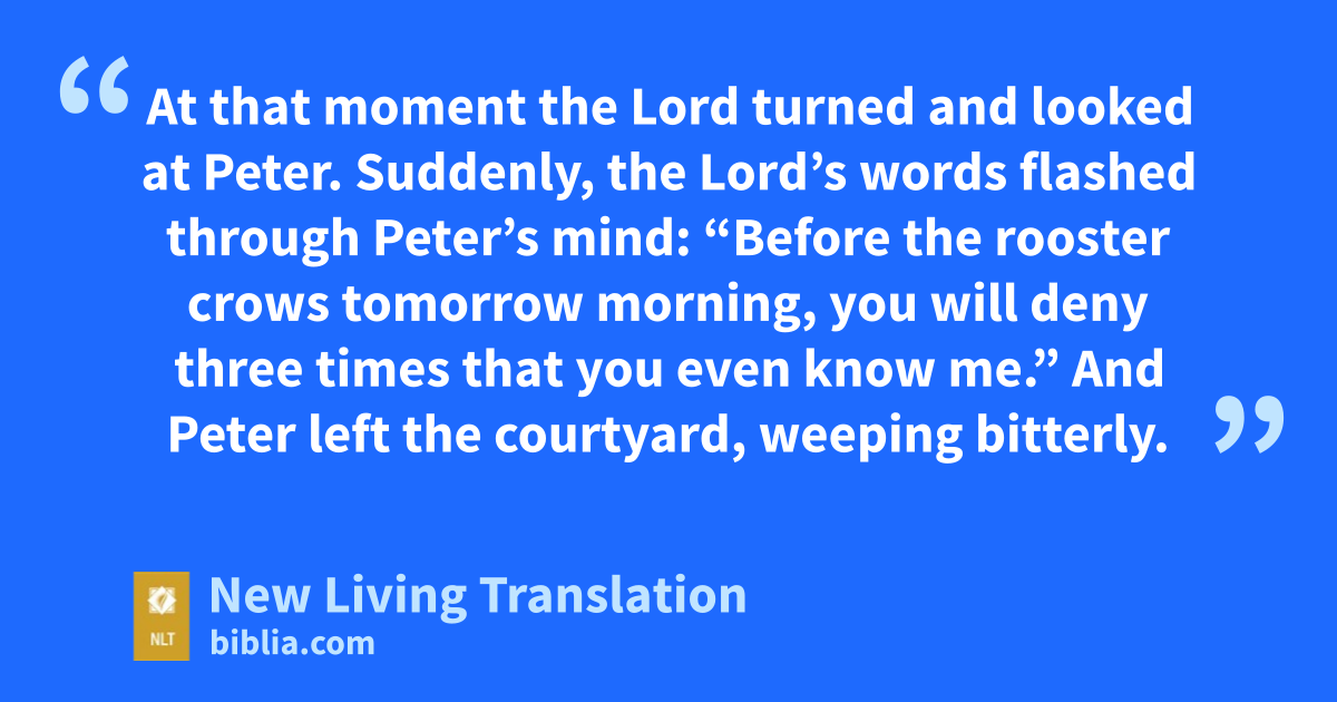 61 At that moment the Lord turned and looked at Peter. Suddenly, the Lord’s words flashed through Peter’s mind: “Before the rooster crows tomorrow morning, you will deny three times that you even know me.” 62 And Peter left the courtyard, weeping bitterly.
