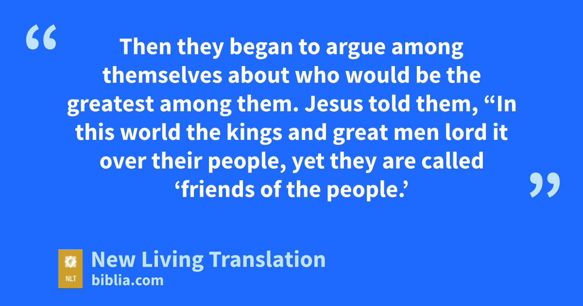 24 Then they began to argue among themselves about who would be the greatest among them. 25 Jesus told them, “In this world the kings and great men lord it over their people, yet they are called ‘friends of the people.’ 26 But among you it will be different. Those who are the greatest among you should take the lowest rank, and the leader should be like a servant. 27 Who is more important, the one who sits at the table or the one who serves? The one who sits at the table, of course. But not here! For I am among you as one who serves.