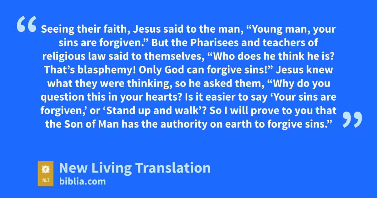 22 Jesus knew what they were thinking, so he asked them, “Why do you question this in your hearts? 23 Is it easier to say ‘Your sins are forgiven,’ or ‘Stand up and walk’? 24 So I will prove to you that the Son of Man* has the authority on earth to forgive sins.” Then Jesus turned to the paralyzed man and said, “Stand up, pick up your mat, and go home!”