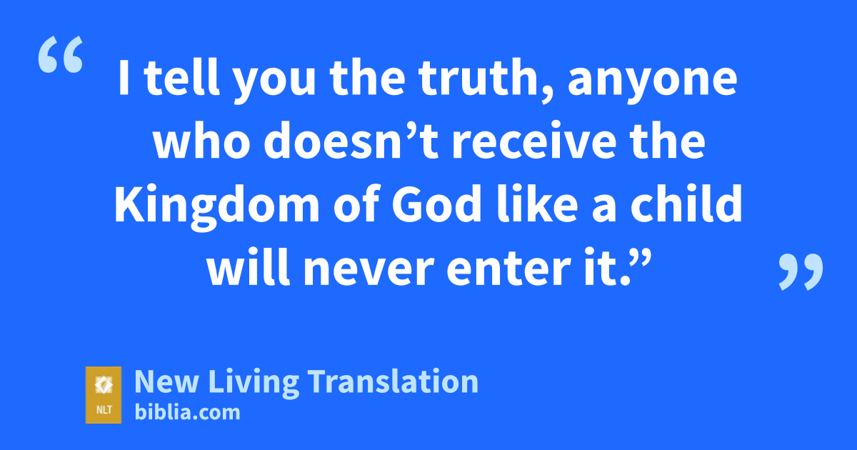 14 When Jesus saw what was happening, he was angry with his disciples. He said to them, “Let the children come to me. Don’t stop them! For the Kingdom of God belongs to those who are like these children. 15 I tell you the truth, anyone who doesn’t receive the Kingdom of God like a child will never enter it.” 16 Then he took the children in his arms and placed his hands on their heads and blessed them.