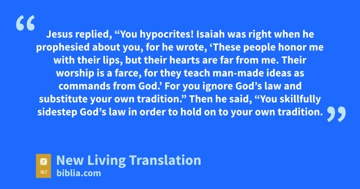 9 Then he said, “You skillfully sidestep God’s law in order to hold on to your own tradition. 10 For instance, Moses gave you this law from God: ‘Honor your father and mother,’* and ‘Anyone who speaks disrespectfully of father or mother must be put to death.’* 11 But you say it is all right for people to say to their parents, ‘Sorry, I can’t help you. For I have vowed to give to God what I would have given to you.’* 12 In this way, you let them disregard their needy parents. 13 And so you cancel the word of God in order to hand down your own tradition. And this is only one example among many others.”