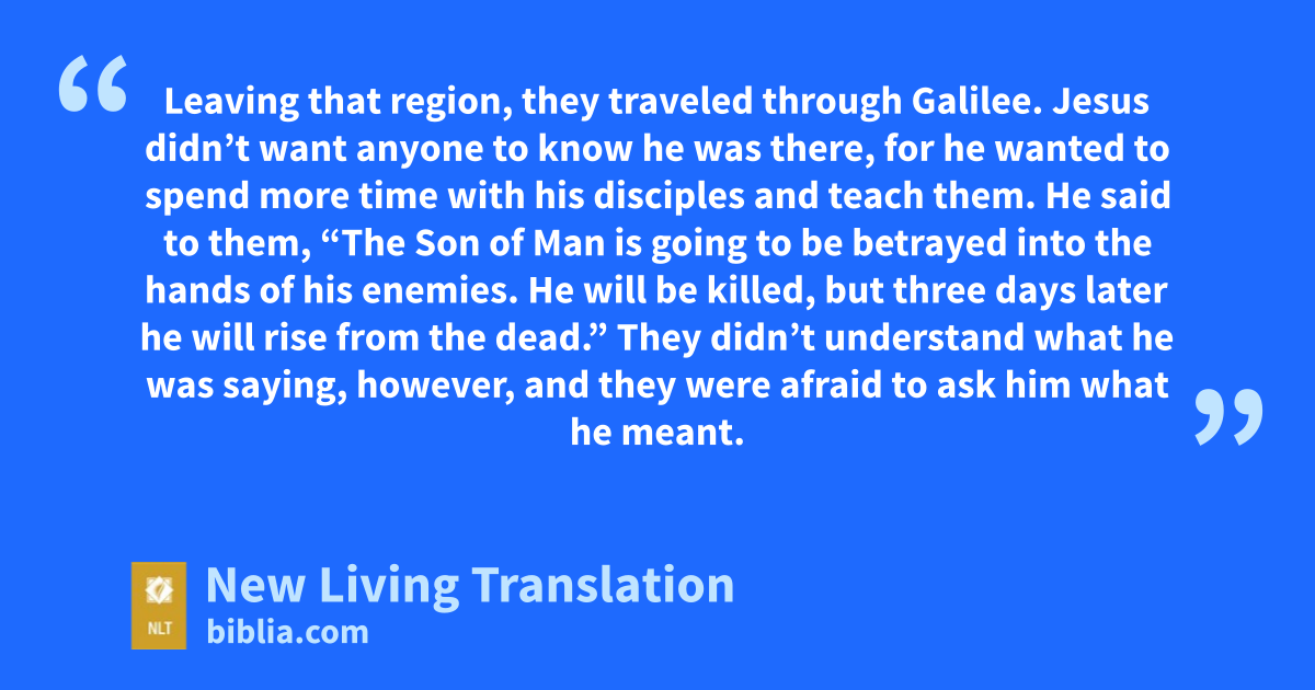 30 Leaving that region, they traveled through Galilee. Jesus didn’t want anyone to know he was there, 31 for he wanted to spend more time with his disciples and teach them. He said to them, “The Son of Man is going to be betrayed into the hands of his enemies. He will be killed, but three days later he will rise from the dead.” 32 They didn’t understand what he was saying, however, and they were afraid to ask him what he meant.