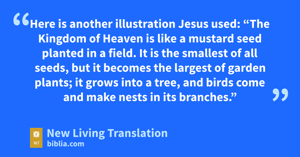 31 Here is another illustration Jesus used: “The Kingdom of Heaven is like a mustard seed planted in a field. 32 It is the smallest of all seeds, but it becomes the largest of garden plants; it grows into a tree, and birds come and make nests in its branches.”
