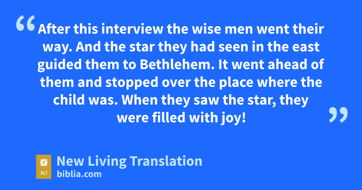 9 After this interview the wise men went their way. And the star they had seen in the east guided them to Bethlehem. It went ahead of them and stopped over the place where the child was. 10 When they saw the star, they were filled with joy! 11 They entered the house and saw the child with his mother, Mary, and they bowed down and worshiped him. Then they opened their treasure chests and gave him gifts of gold, frankincense, and myrrh.