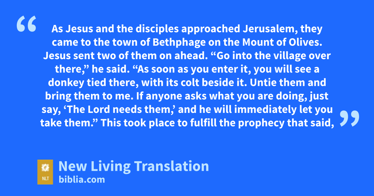 As Jesus and the disciples approached Jerusalem, they came to the town of Bethphage on the Mount of Olives. Jesus sent two of them on ahead. 2 “Go into the village over there,” he said. “As soon as you enter it, you will see a donkey tied there, with its colt beside it. Untie them and bring them to me. 3 If anyone asks what you are doing, just say, ‘The Lord needs them,’ and he will immediately let you take them.”