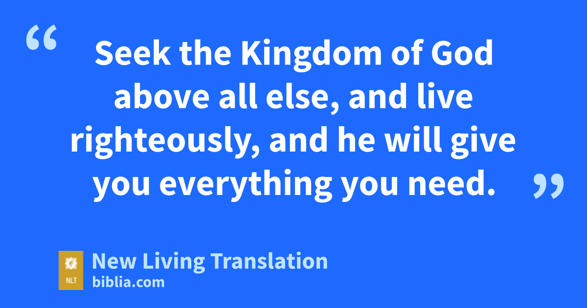 31 “So don’t worry about these things, saying, ‘What will we eat? What will we drink? What will we wear?’ 32 These things dominate the thoughts of unbelievers, but your heavenly Father already knows all your needs. 33 Seek the Kingdom of God* above all else, and live righteously, and he will give you everything you need.