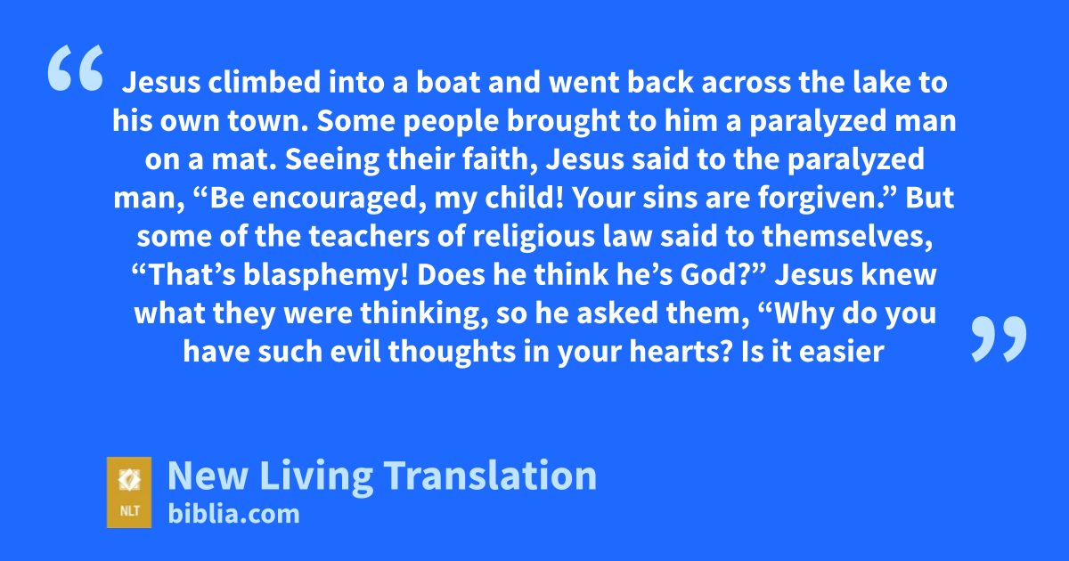 Jesus climbed into a boat and went back across the lake to his own town. 2 Some people brought to him a paralyzed man on a mat. Seeing their faith, Jesus said to the paralyzed man, “Be encouraged, my child! Your sins are forgiven.”