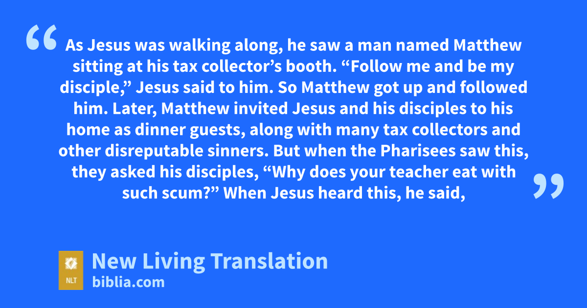 9 As Jesus was walking along, he saw a man named Matthew sitting at his tax collector’s booth. “Follow me and be my disciple,” Jesus said to him. So Matthew got up and followed him.