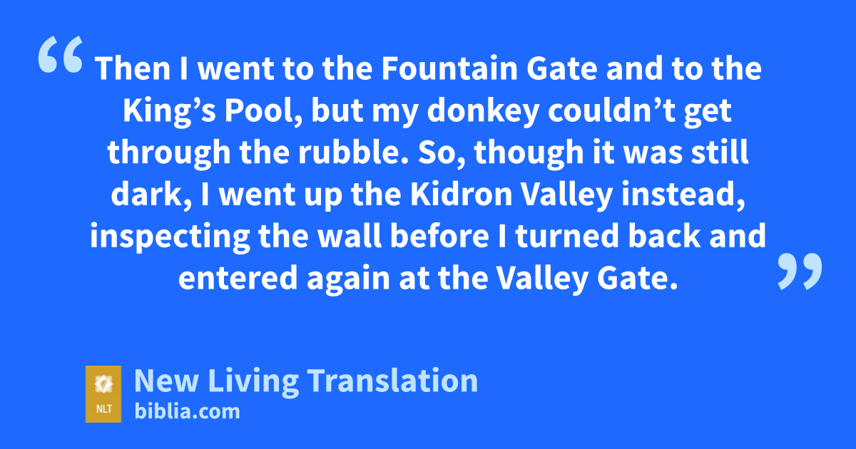 11 So I arrived in Jerusalem. Three days later, 12 I slipped out during the night, taking only a few others with me. I had not told anyone about the plans God had put in my heart for Jerusalem. We took no pack animals with us except the donkey I was riding. 13 After dark I went out through the Valley Gate, past the Jackal’s Well,* and over to the Dung Gate to inspect the broken walls and burned gates. 14 Then I went to the Fountain Gate and to the King’s Pool, but my donkey couldn’t get through the rubble. 15 So, though it was still dark, I went up the Kidron Valley* instead, inspecting the wall before I turned back and entered again at the Valley Gate.