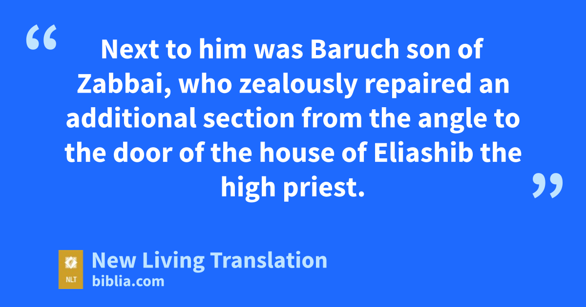19 Next to them, Ezer son of Jeshua, the leader of Mizpah, repaired another section of wall across from the ascent to the armory near the angle in the wall. 20 Next to him was Baruch son of Zabbai, who zealously repaired an additional section from the angle to the door of the house of Eliashib the high priest. 21 Meremoth son of Uriah and grandson of Hakkoz rebuilt another section of the wall extending from the door of Eliashib’s house to the end of the house.